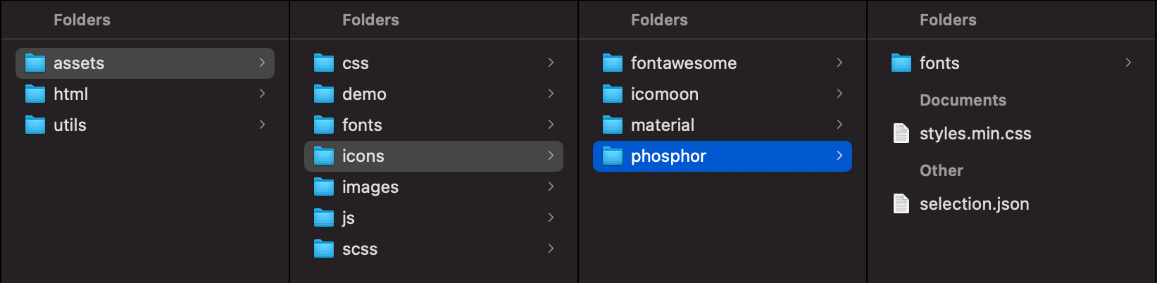 All icon font styles are also stored in SCSS files, you can find them in scss/shared/icons/ folder. All icon sets have same file structure and same compilation logic. Gulp file includes a separate task that compiles styles.scss file into styles.min.css, which is used in the template. You can combine multiple tasks in Gulp or any other compiler and include icon font in the main flow. Just make sure all file paths are correct.