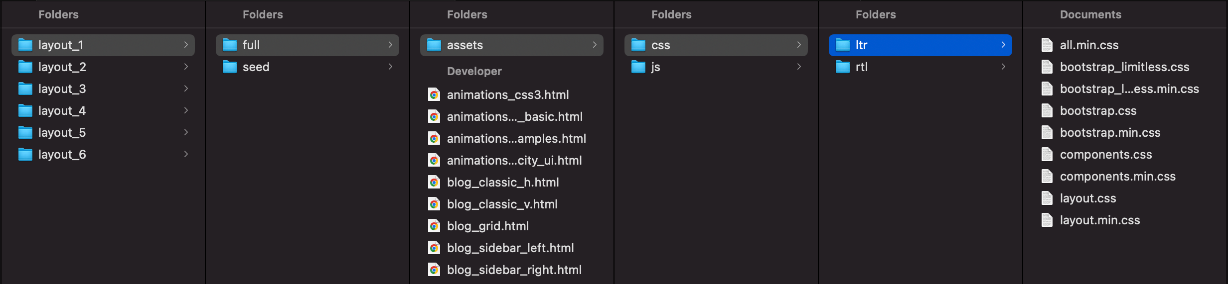 bootstrap.css,*.min.css- Bootstrap core, always use minifiedbootstrap_limitless.css,*.min.css- Bootstrap core overrideslayout.css,*.min.css- layout basecomponents.css,*.min.css- all template components and pluginsall.min.css- everything