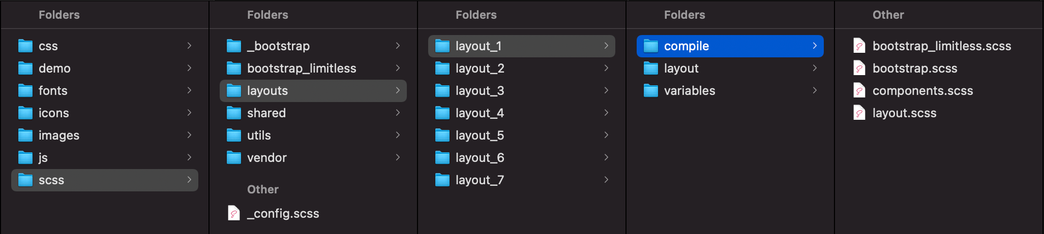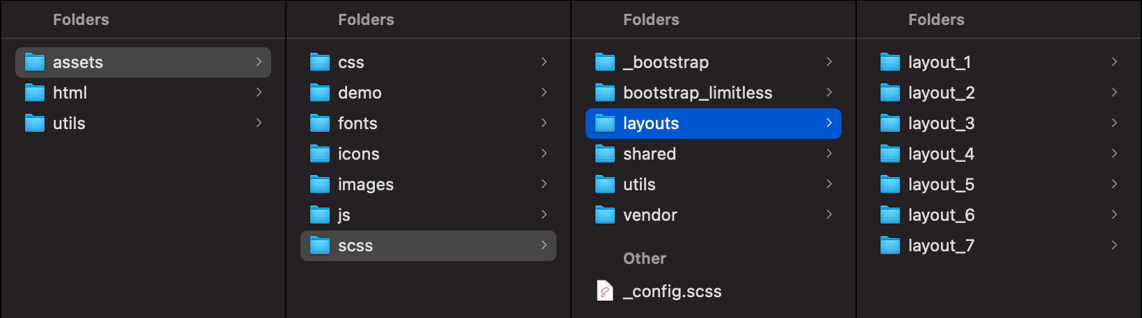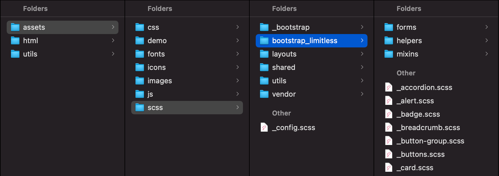 All Limitless styles are based on SCSS pre-processor - it extends the CSS language, adding features that allow variables, mixins, functions and many other techniques that allow you to make CSS that is more maintainable, themable and extendable. In total there are 180 fully commented SCSS files, including: Bootstrap components core, Bootstrap core overrides, layout and component related files. All files are properly divided into categories and stored inside nested folders: