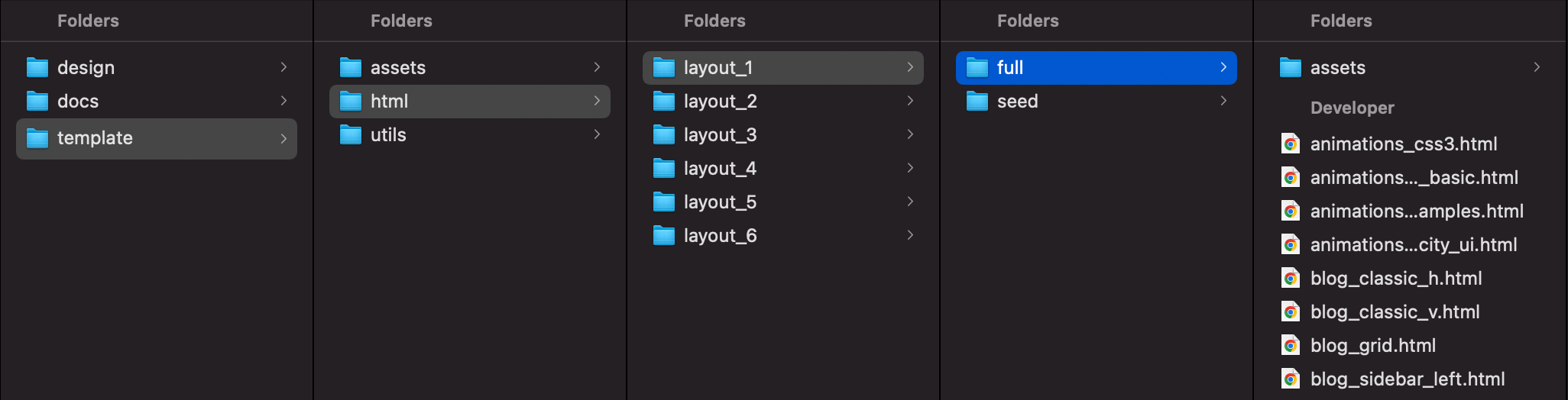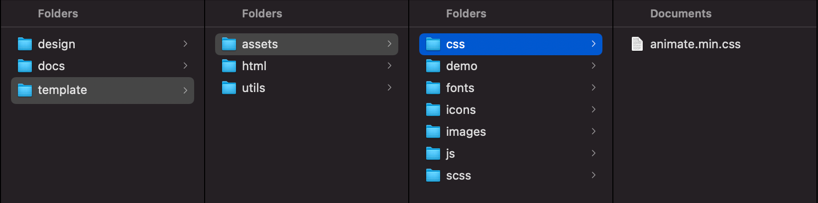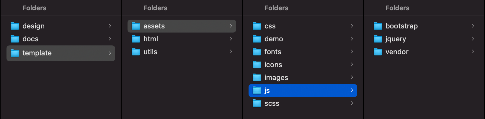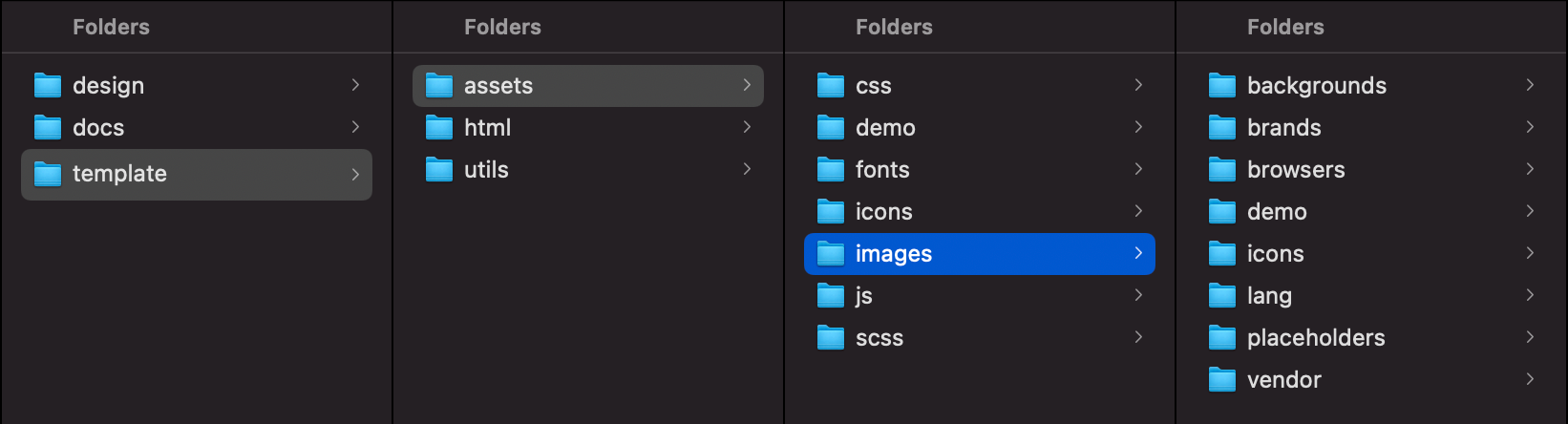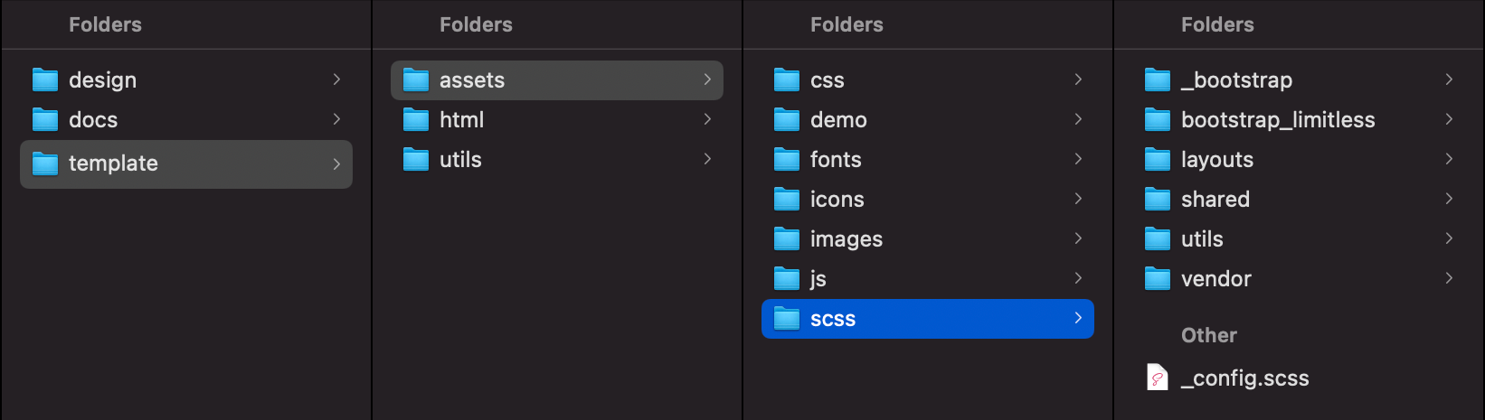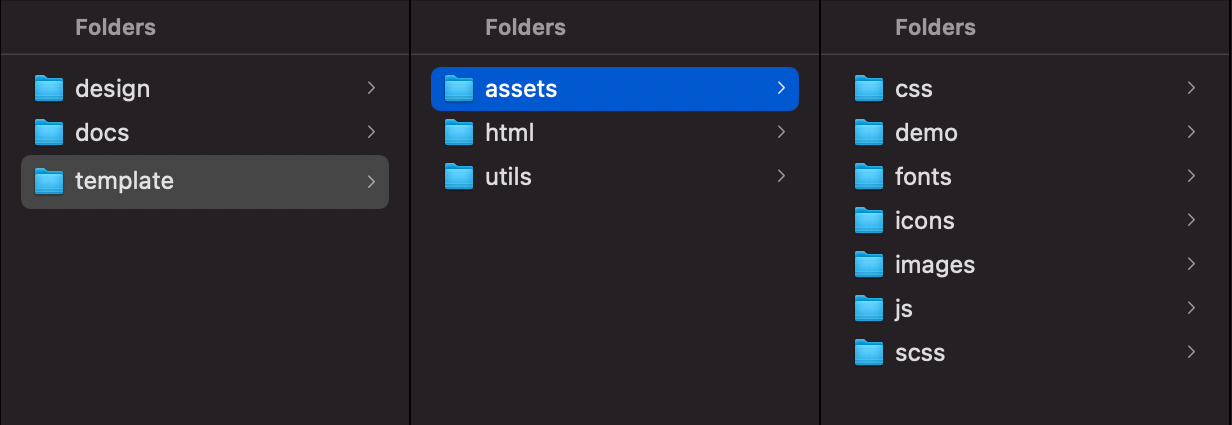 By default, Limitless includes HTML, SCSS, compiled CSS, JS, JSON/TSV/CSV, fonts and image files. All these files are properly commented/named and stored inside separate folders, so if you know what you are looking for, should be relatively easy to find it. Template package root includes 6 main folders. Each folder includes related folders and files that correspond to their purpose. Main folders are: