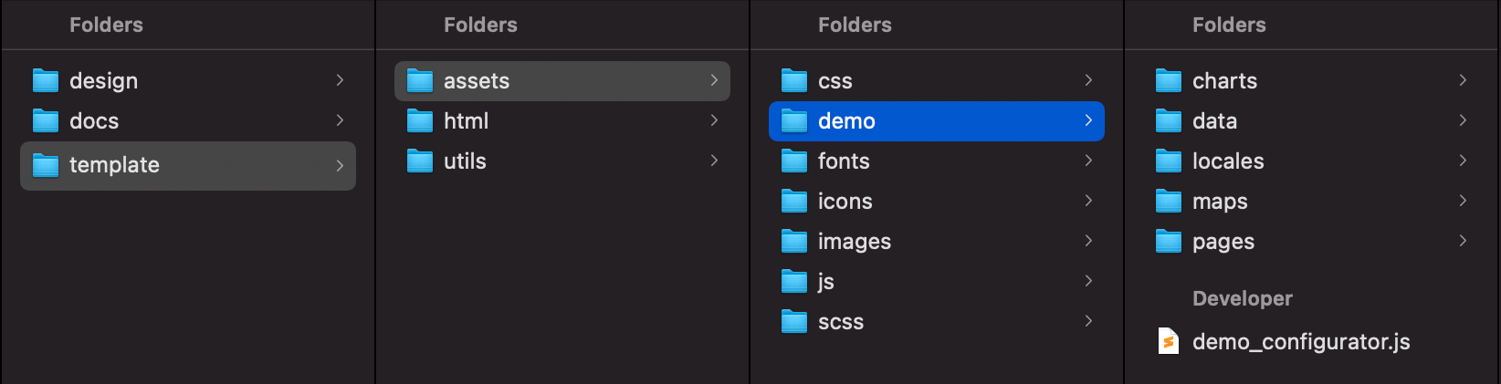 Assets folder contains 7 sub folders, each folder includes a bunch of subfolders with related files. /demo/ folder is used for demo purposes only, it contains JSON/TSV/CSV files with demo data for multi level tree, maps, typeahead, file uploaders, wizard, charts, JS files for pages and internationalization. Main asset subfolders are: